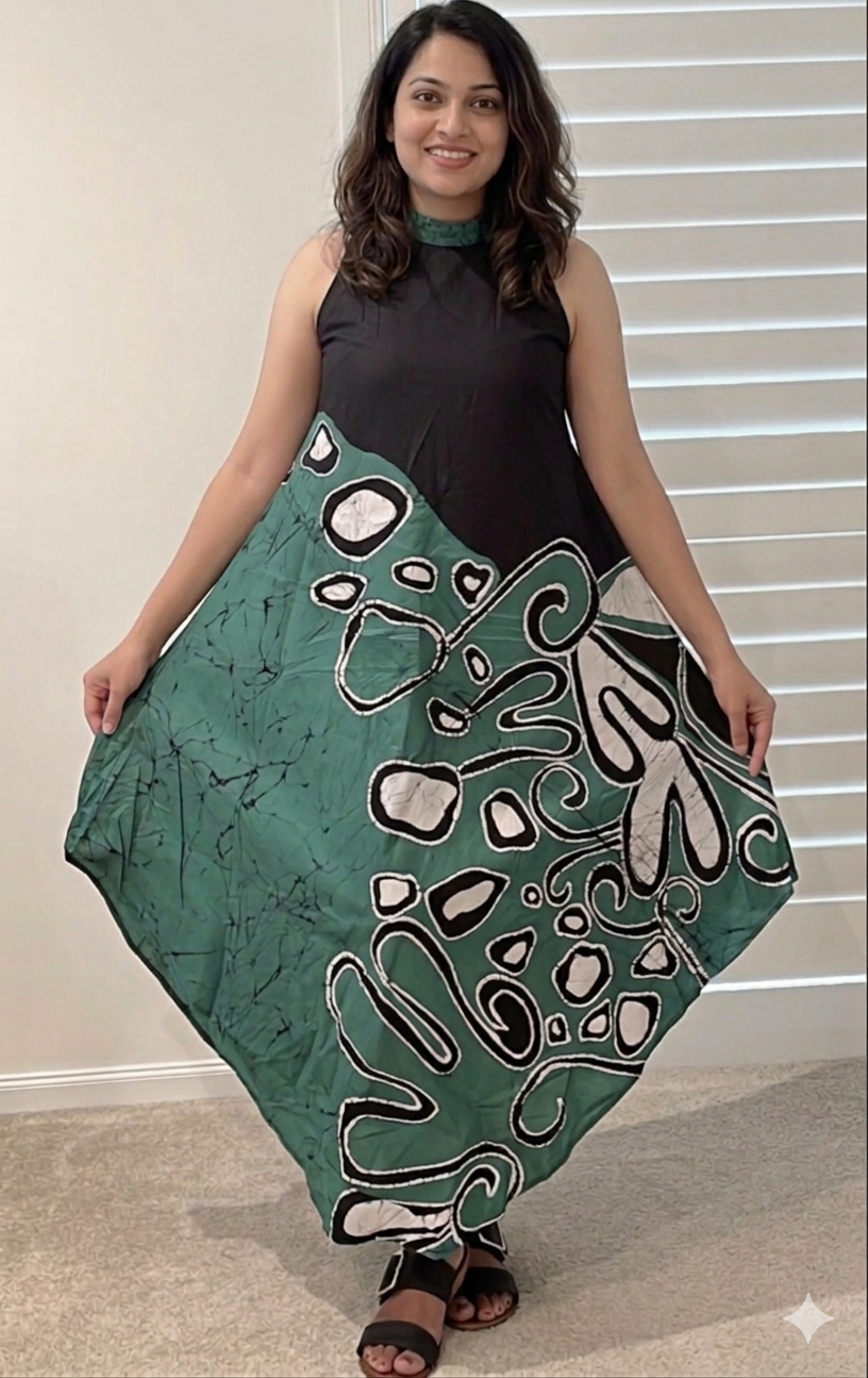 Embrace elegance with our handcrafted Black & Green Sleeveless Batik Dress, a perfect blend of tradition and modern style. Made from premium-quality fabric, this dress showcases authentic Sri Lankan batik artistry, featuring intricate patterns and vibrant hues that stand out effortlessly.