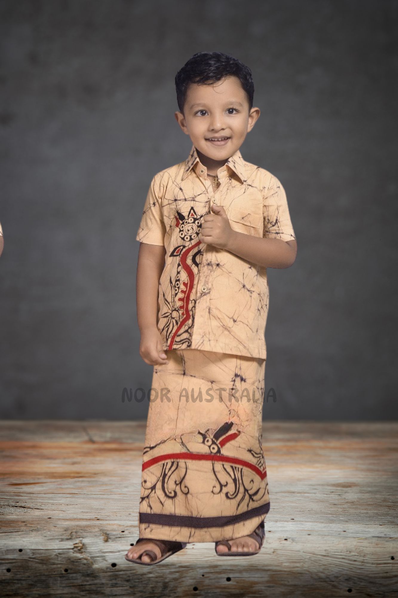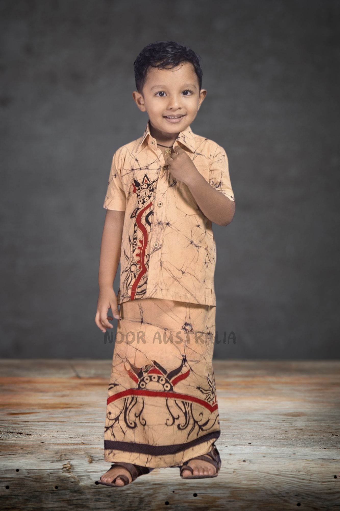 A kid’s batik shirt sarong kit designed in traditional designs on a beige background with red and black color combination for cute little boys.