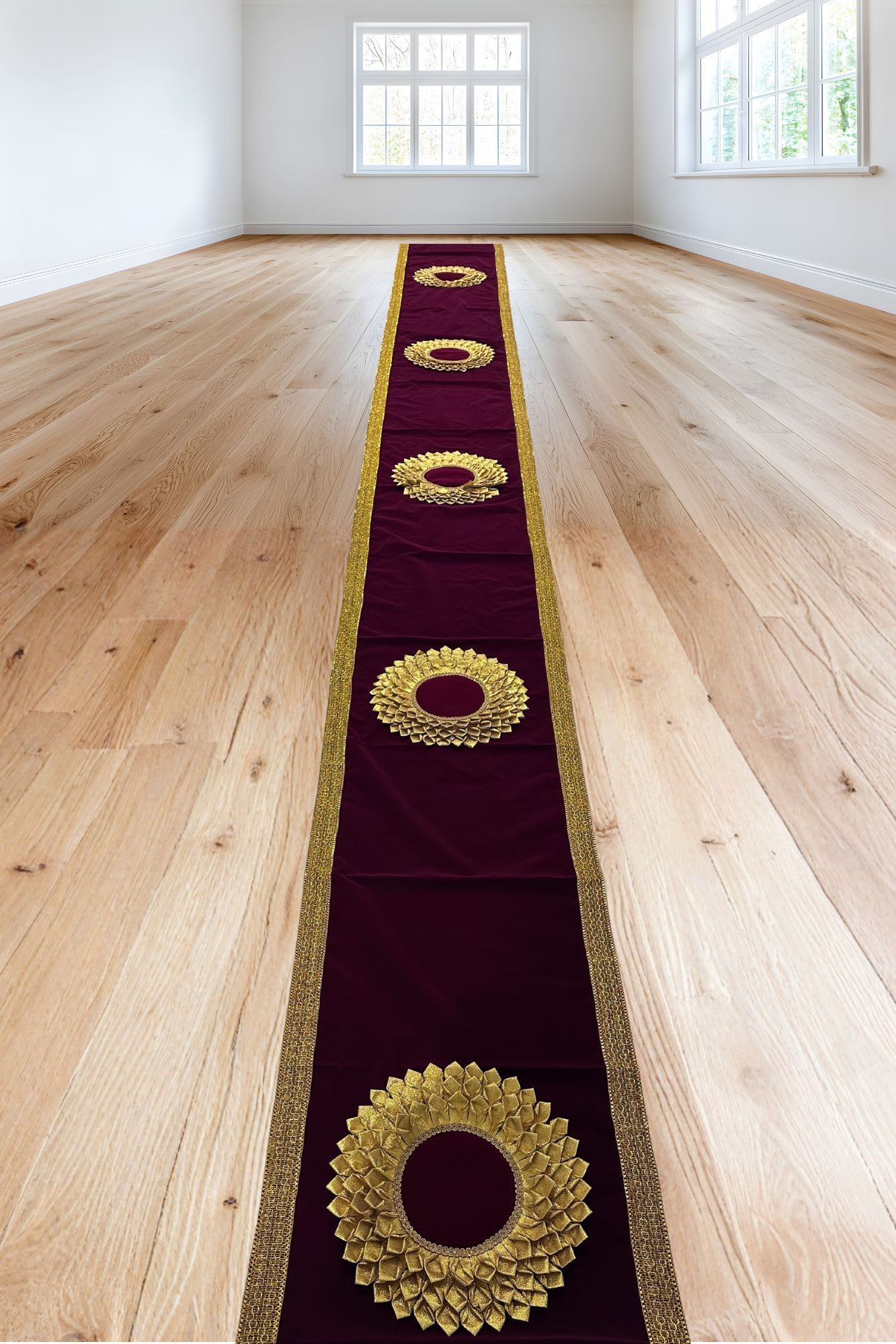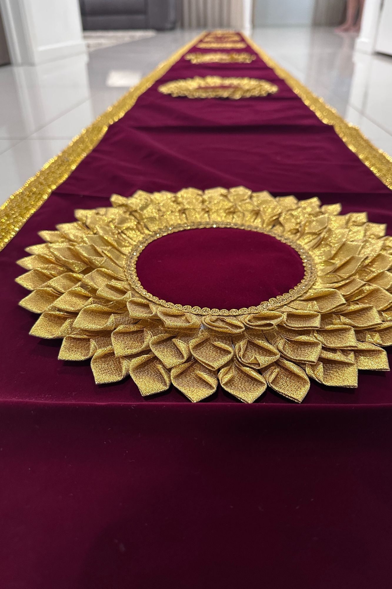 Welcome peace, respect, and elegance into your home with this 20-foot velvet pawada (rug). Made from high-quality velvet fabric, it offers a soft, rich texture that beautifully complements any traditional or modern setting.