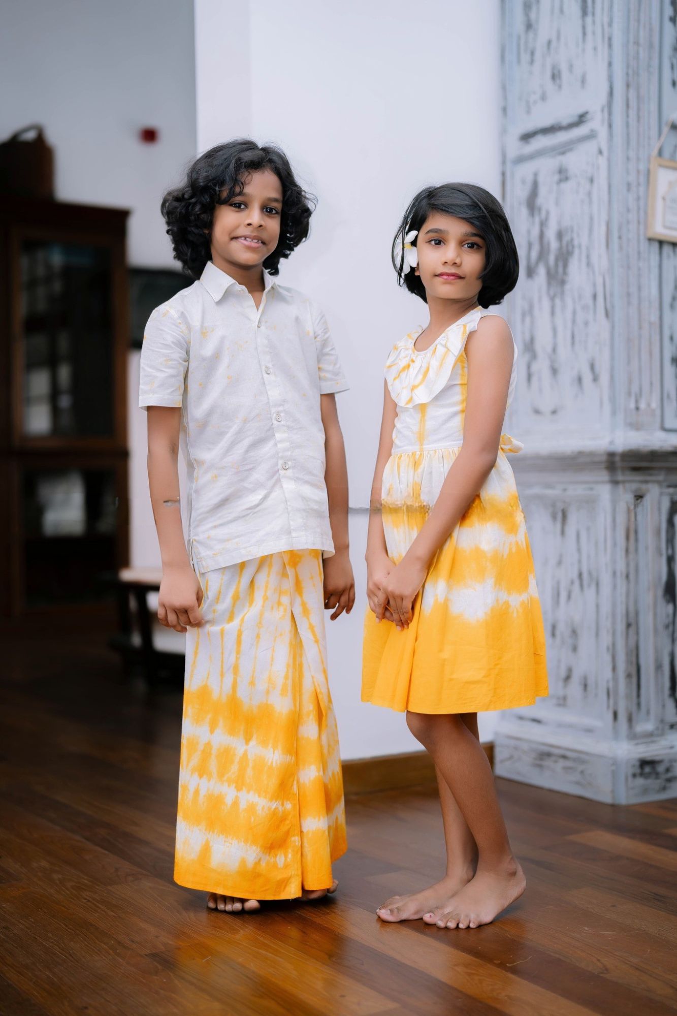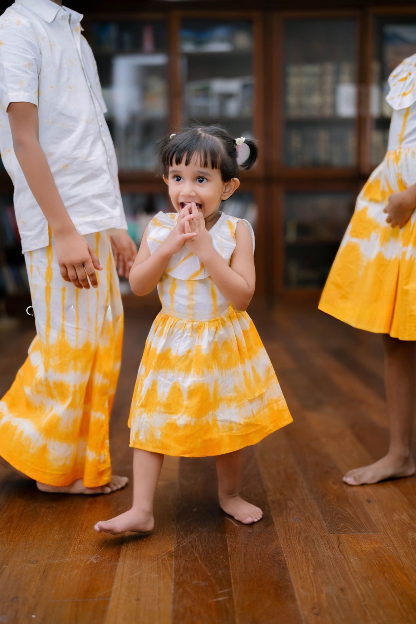 Brighten up any occasion with our Sunbeam Batik Dress for girls. This charming dress features delicate shoulder tie straps and a vibrant yellow and white batik design. Perfect for warm-weather outings, family celebrations, or festive occasions, this outfit ensures style and comfort in every twirl.