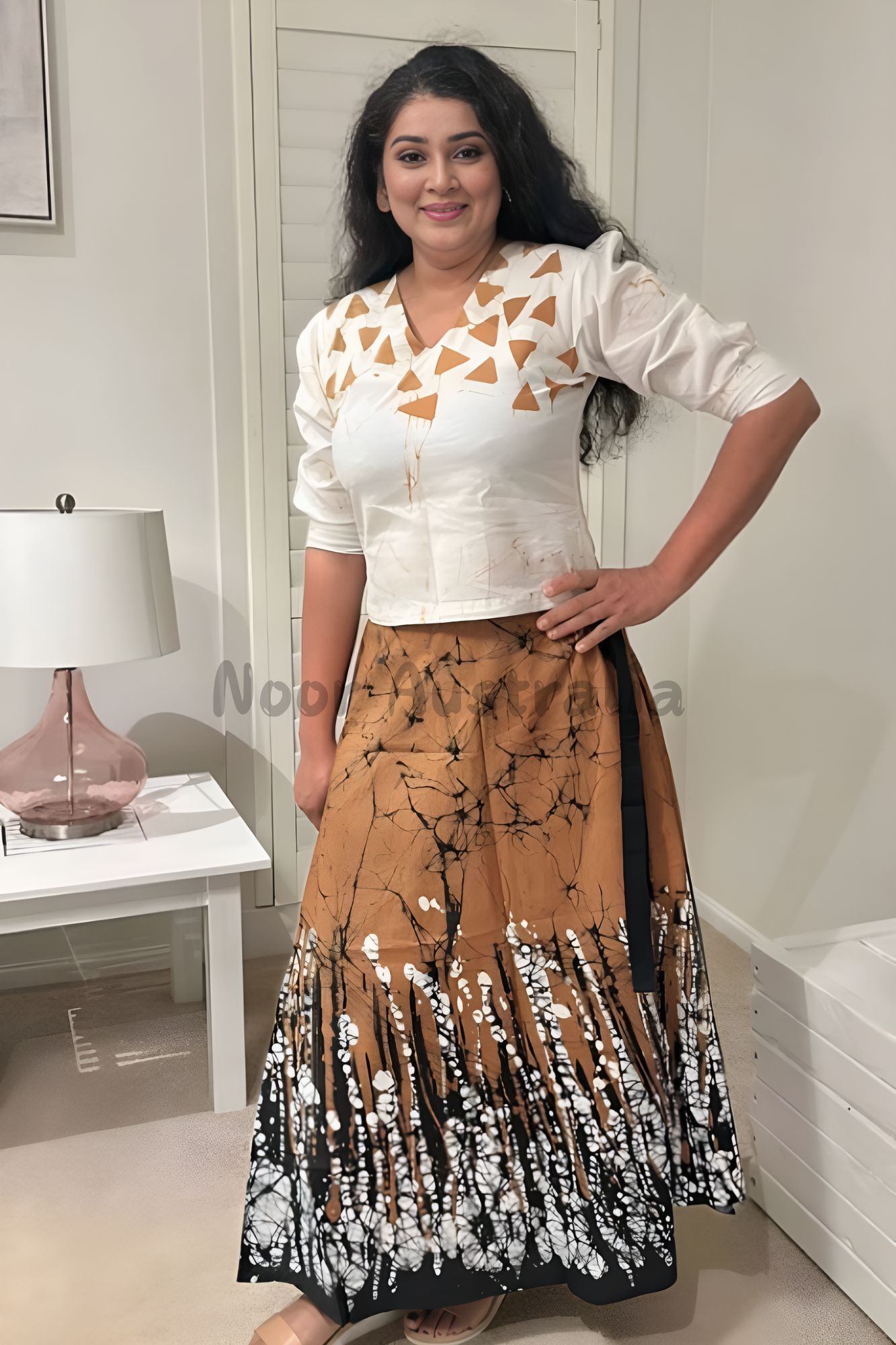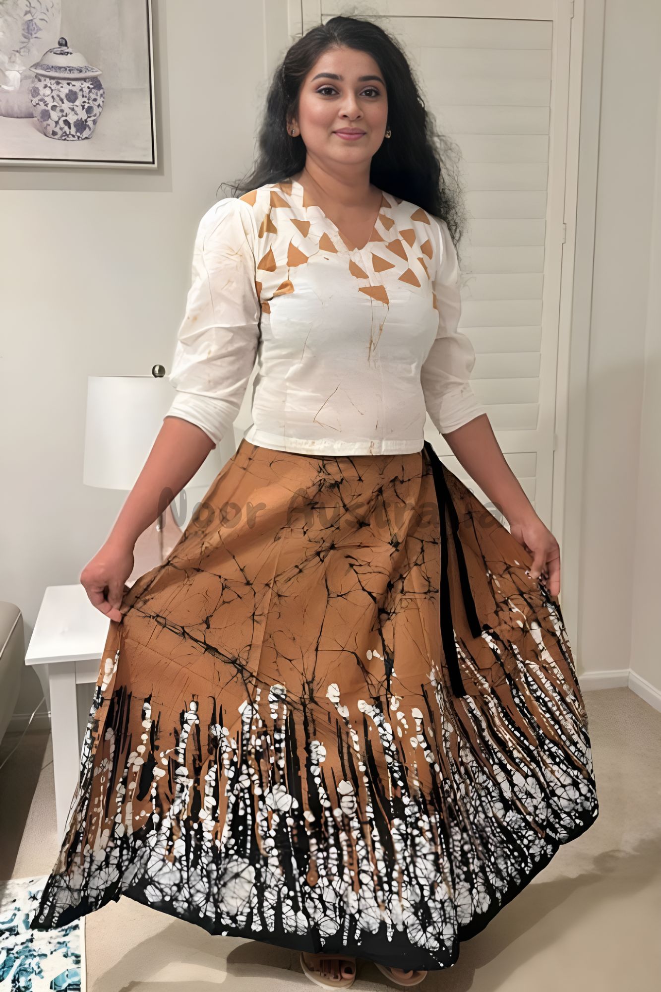 A beautiful Sri Lankan handmade batik outfit featuring a short blouse and a flowing long skirt. The blouse comes in white with a unique geometric batik pattern around the neckline and shoulders, giving it a modern touch. The long skirt is designed in warm earthy brown tones with striking black and white batik detailing along the hem, creating an elegant contrast. Perfect for cultural events, special occasions, or as a stylish traditional wear with a contemporary flair.